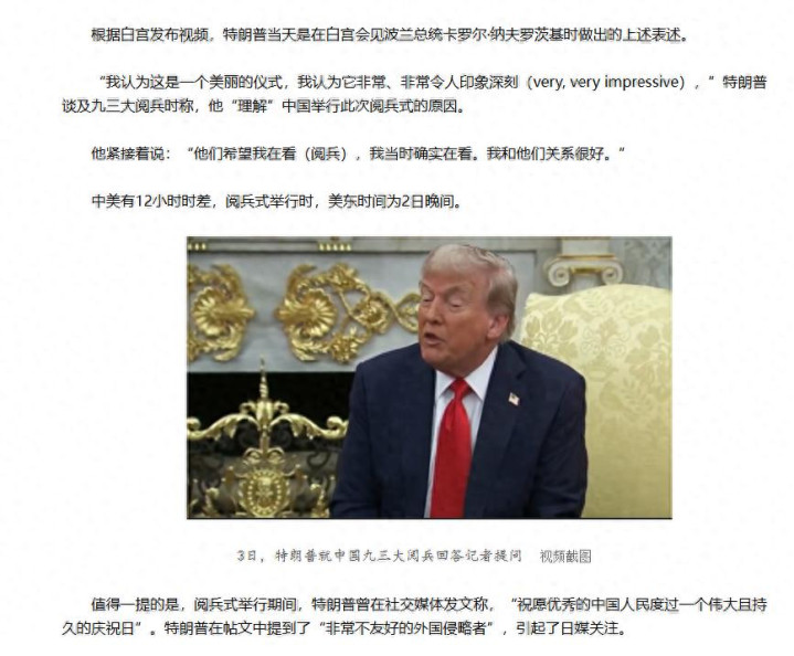据观察者网等媒体消息,9月3日特朗普在白宫接见来访的波兰总统纳夫罗茨基时向媒体表示,他们(中国)希望我在看这场阅兵仪式,而我当时确实在看。我和他们关系很好。